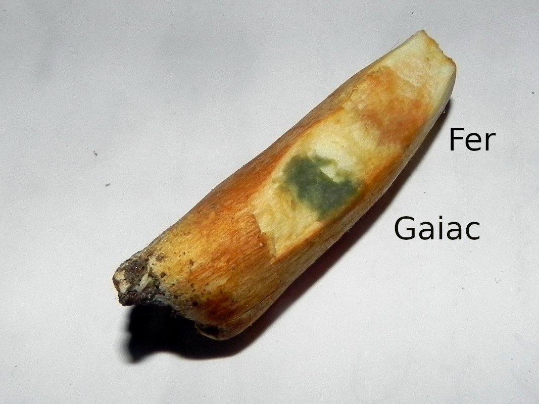 Je commente ce "presque tout". Les descriptions parlent d'une Russule à chapeau de couleur variable, mais dans les tons violacés, avec un centre plus sombre, à marge cannelée. La chair est douce, jaunissante. Toute la russule est plus ou moins jaunissante. Les réactions chimiques sont bleu vif rapide au gaïac, ocre-orange au fer.