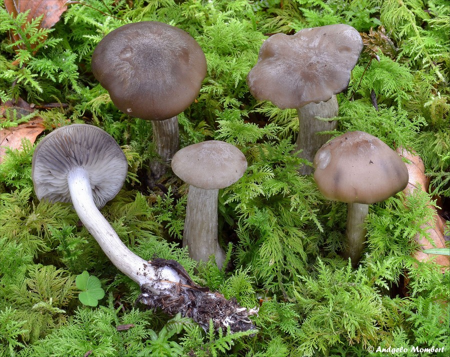 Lyophyllum deliberatum (=L. infumatum), un Lyophyllum à lames bleuissant puis noircissant au frottement, et à spores losangiques.