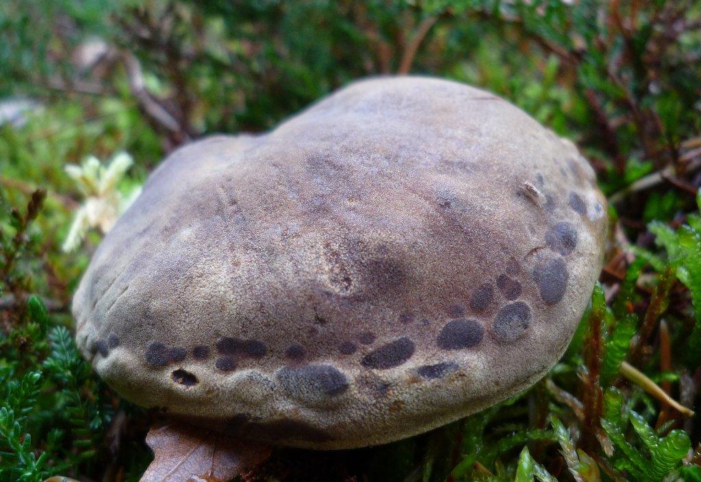 Chapeau : 6.2 cm de diamètre. Sec et nettement velouté. Brun assez sombre et s'éclaircissant un peu plus vers la marge, avec présence de zones ressemblants à des guttules plus foncées.