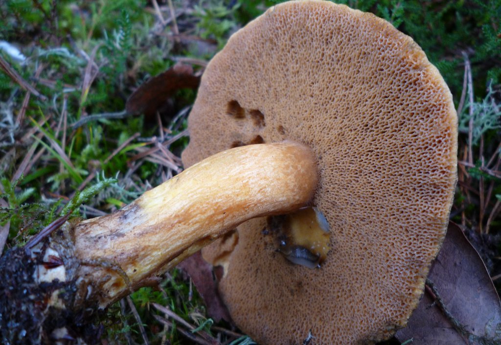 Pores : assez amples et irréguliers. d'un couleur assez lumineuse dans le brun. Un peu rosâtre presque en périphérie. A la blessure, un bleuissement apparaît progressivement mais nettement en bleu foncé.