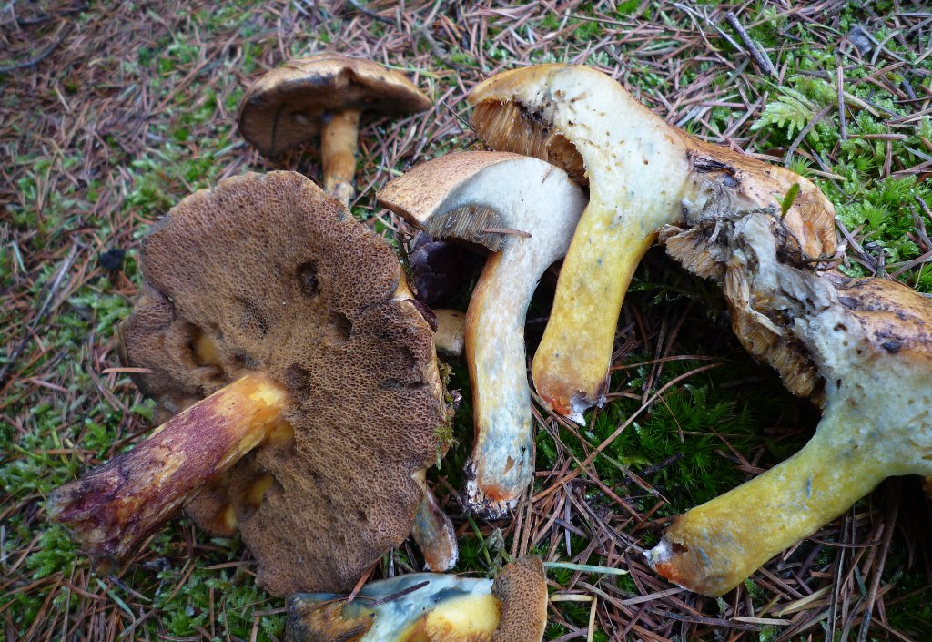 Je propose Suillus variegatus (bolet moucheté), tout en restant intrigué par ce bleuissement parfois assez intense et généralisé sur certains exemplaires. Il y a aussi cette base nettement rouge à l'intérieur du pied, que je ne vois pas indiquée et présente sur tous les exemplaires.