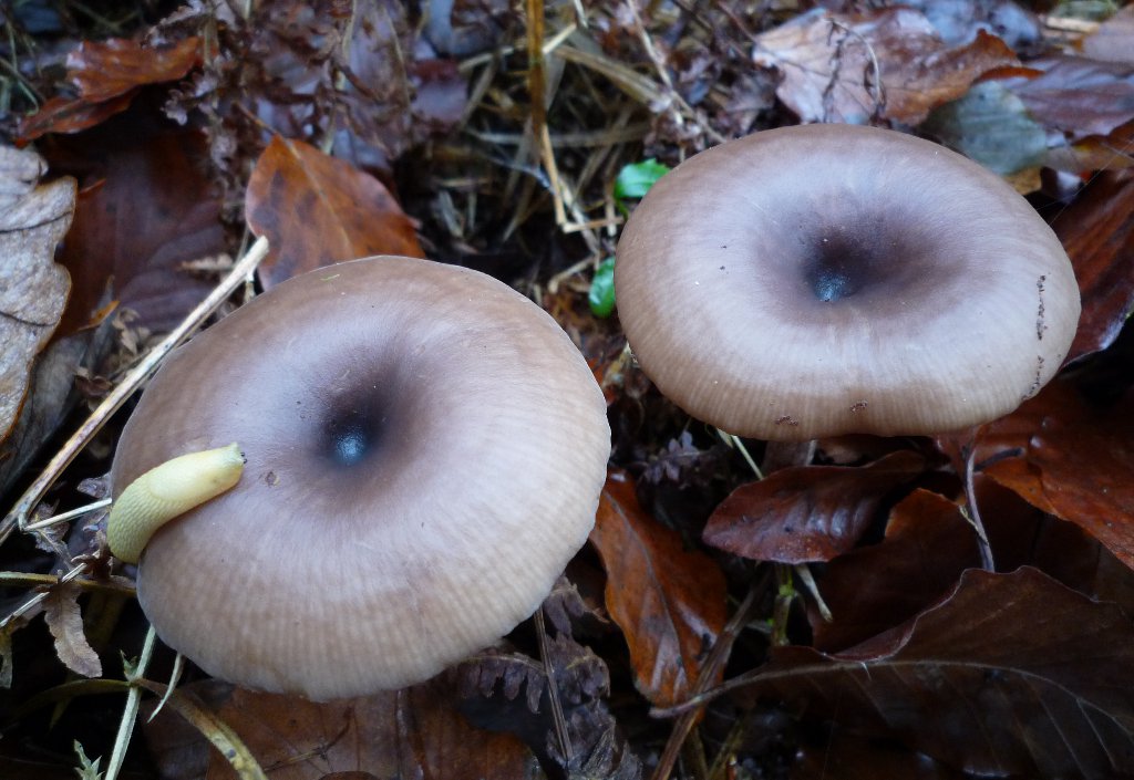 Chapeau : jusque 7.6 cm. Très creusé au centre. Lisse, un peu gras. Strié sur les exemplaire frais. Les stries ne sont plus apparentes sur les exemplaire moins frais (photo n°2), dont le chapeau est devenu plus terne. Brun foncé au centre puis brun plus clair ensuite. Les exemplaires plus secs sont davantage clairs. Hygrophane au séchage, le temps de faire une sporée.