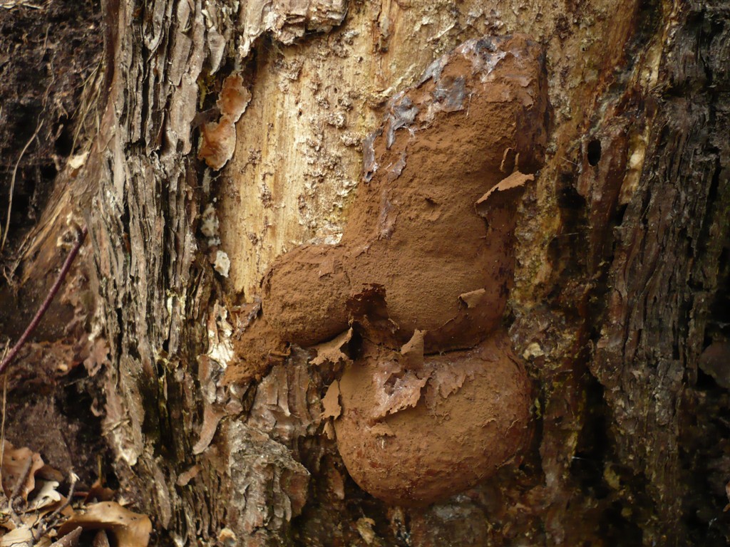 J'ai rencontré cette chose - un myxomycète?- sur pin sylvestre mort. Il semble avoir perdu son enveloppe et ne laisse apparaitre que cet amas brun de spores friable. Il fait environ 20 cm sur 6 cm. Une idée mes amis? Merci