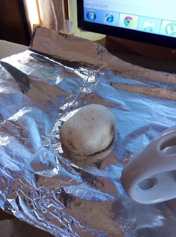 1) Pour commencer j'ai posé un champignon de paris sur un papier d’aluminium (après avoir couper le pied du champignon a ras le chapeau): 2) Ensuite j'ai posé un verre dessus (verre sterilisé):