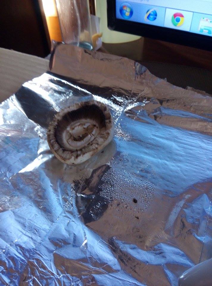 1) Pour commencer j'ai posé un champignon de paris sur un papier d’aluminium (après avoir couper le pied du champignon a ras le chapeau): 2) Ensuite j'ai posé un verre dessus (verre sterilisé):