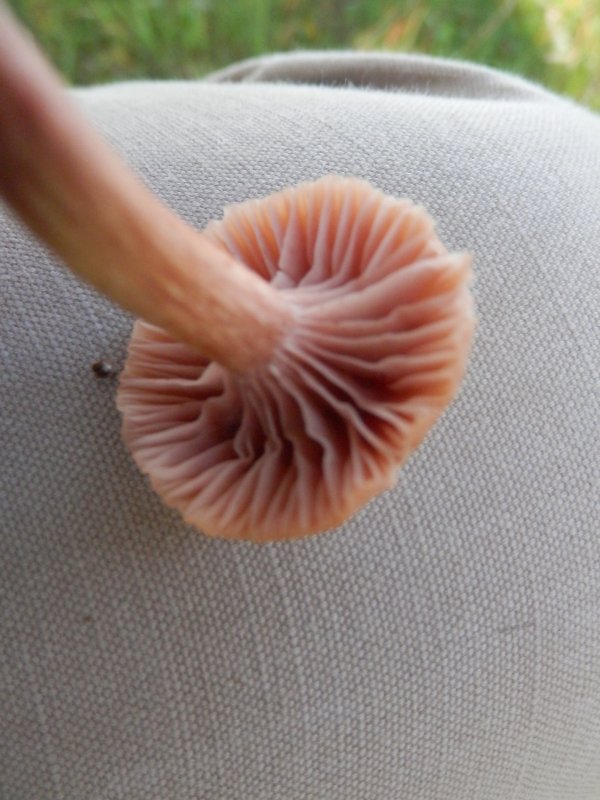 Quant à celui là je ne vois rien d'autre que Laccaria. Mais il ne me semble pas typique, en particulier la forme des lames et la couleur du chapeau. C'est surtout la taille, le pied et al couleur des lames qui me permettent de proposer cette identification.