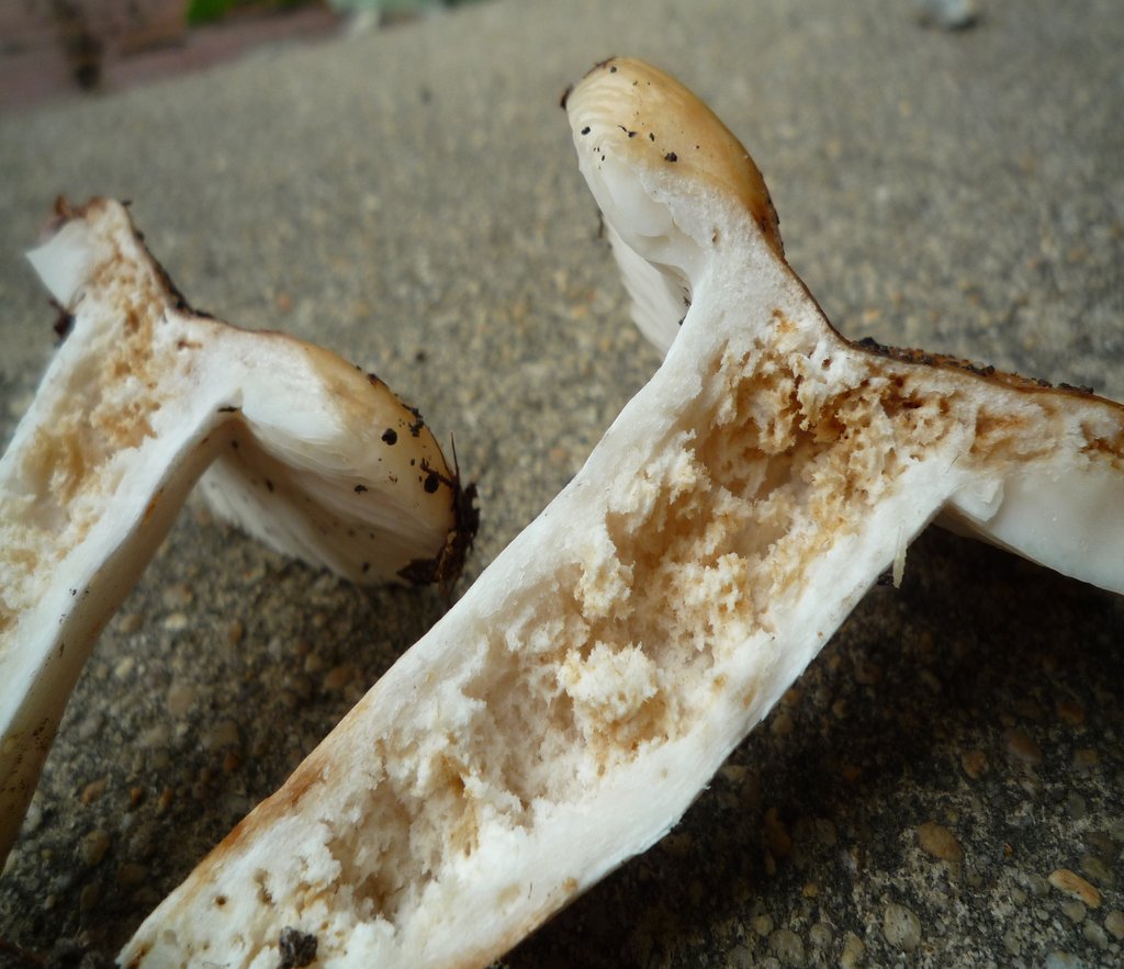 Lames : non blanches, crème à presque un peu saumonées, non piquetées de brun.