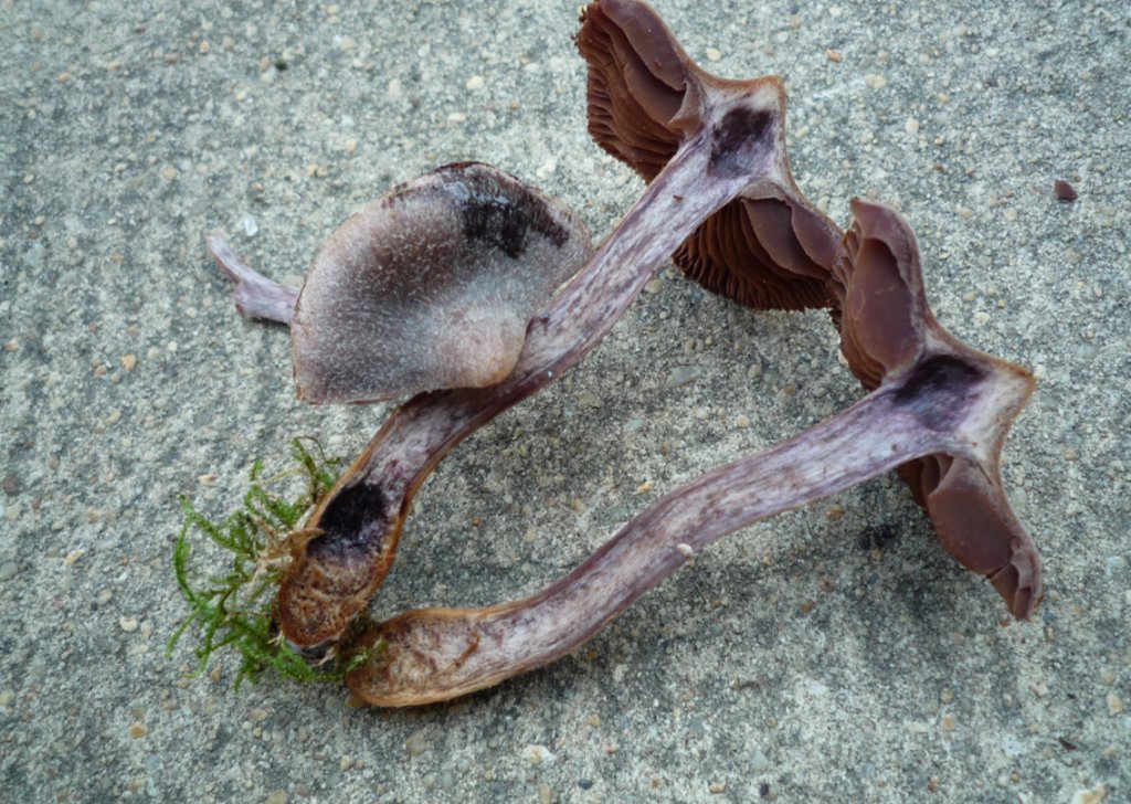 Chair : brun sur l'extérieur à roux vers la base, sinon plutôt gris crème. Un peu violacée en haut du pied.