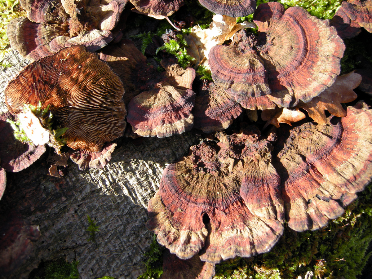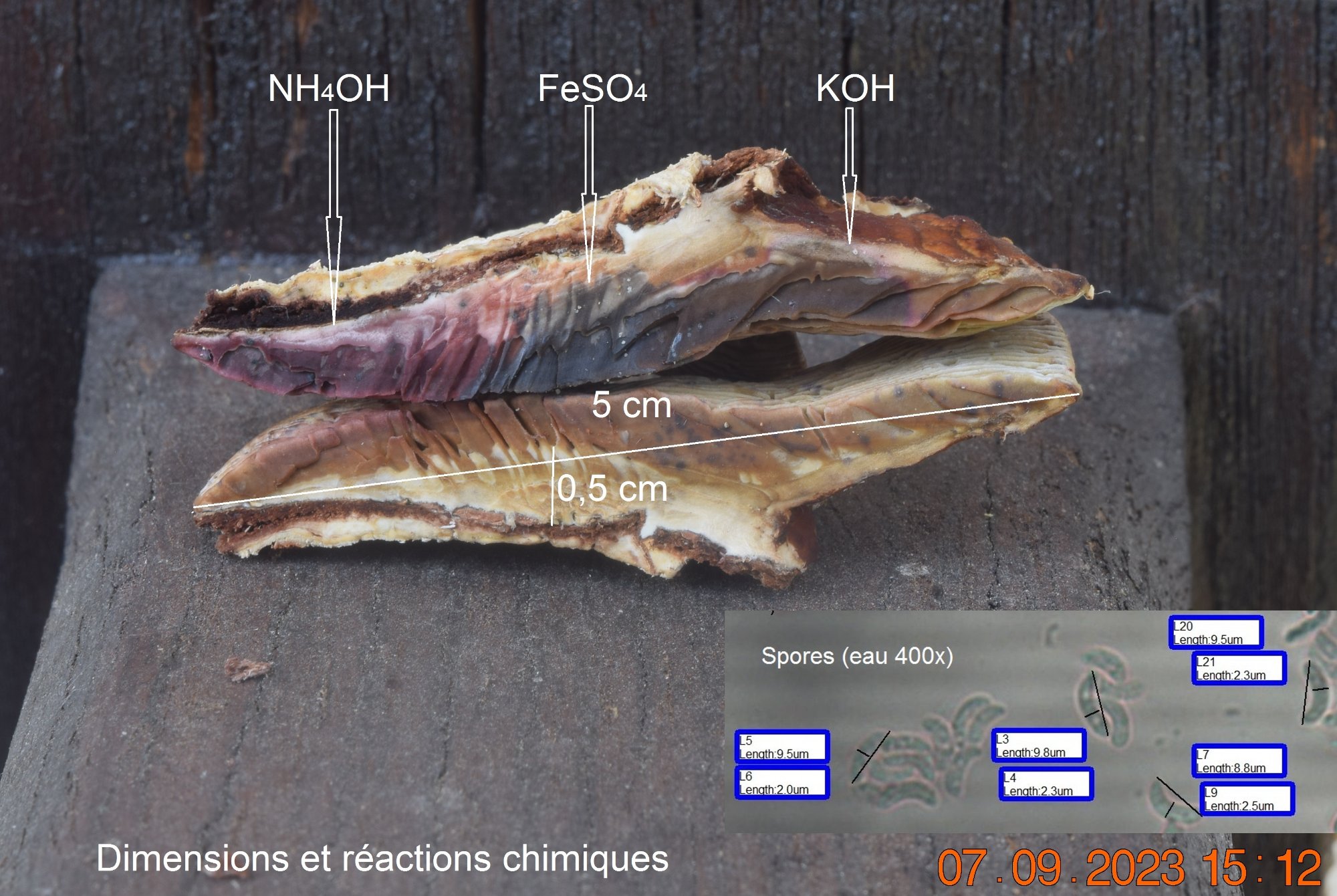 Au jardin hier, deux ou trois exemplaires hélas sur une branche de cerisier. Taille 4-5 cm. D'abord cru à un polypore inconnu de moi mais finalement c’est un jeune Daedaleopsis tricolor avec son hyménium dédaléen lamelliforme (merci de me corriger si je me trompe). Comme toujours déjà de très belles couleurs.