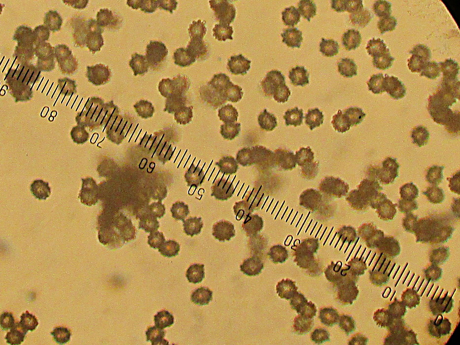 Voilà déjà les spores (échelle 1div = 2,5µ) :