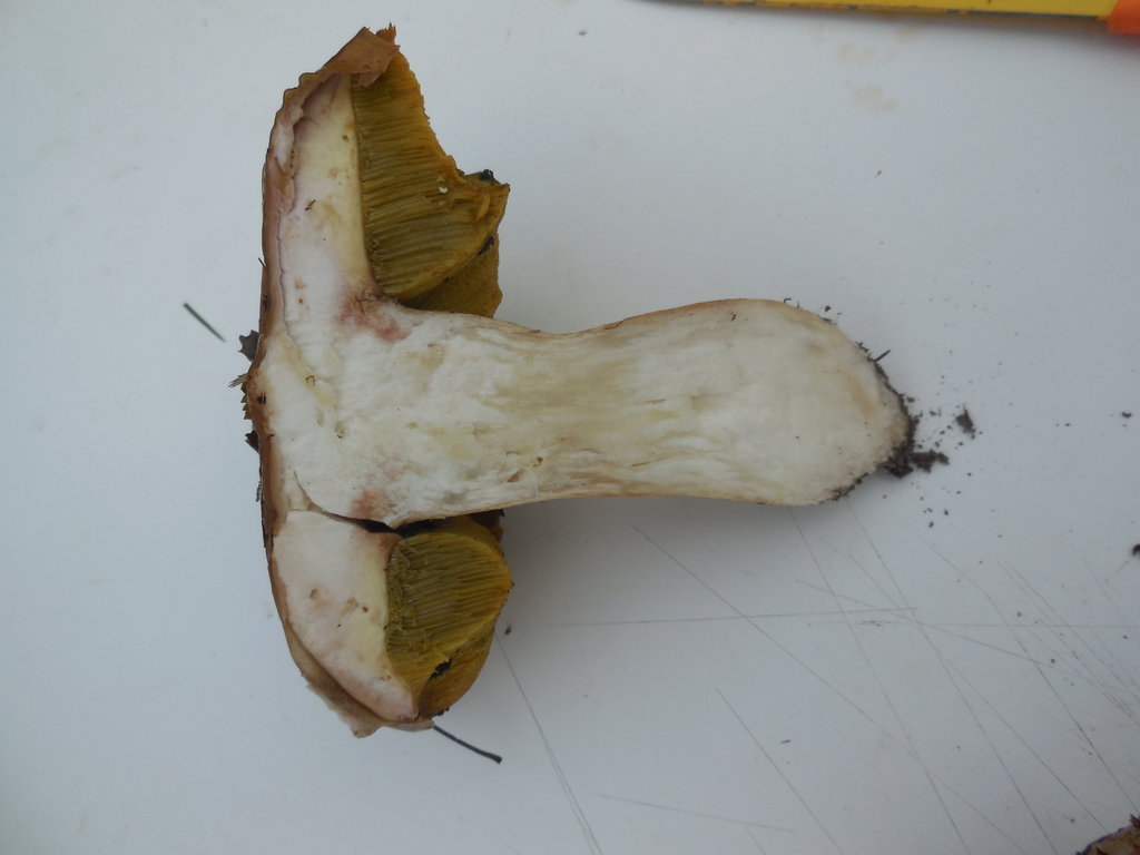 La cuticule s'enlève facilement, et en dessous de celle-ci, le chapeau est blanc-rosé. Je l'ai trouvé sur le bord d'un chemin dans un bois de feuillus, sous des fougères. Le chapeau est d'environ 10-12 cm de diamètre. Les pores jaunes-verdâtres, et la sporée olivâtre.