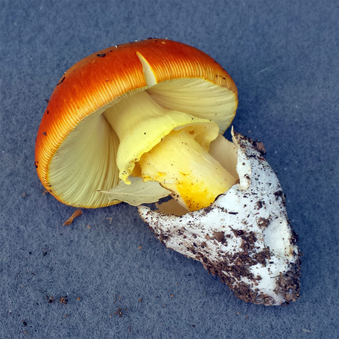 - Pied robuste, concolore aux lames, farci chez les plus grands exemplaires, portant un anneau (également jaune) et chaussé d'une ample volve en sac blanche, épaisse, évasée vers le haut et pointue en bas ; certains exemplaires sortaient à peine de l'oeuf ;