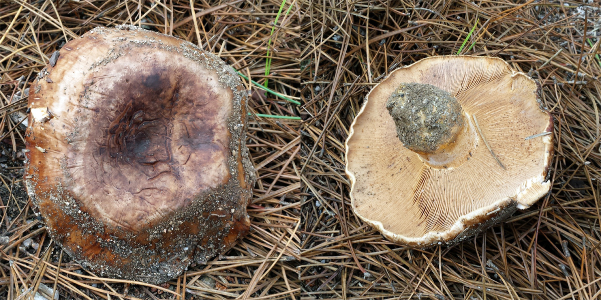 Celui de la première photo avait été renversé par un promeneur (bord de chemin), l'autre à moitié déterré par les sangliers, ceci et la sécheresse des 3 premières semaines d'Octobre expliquant leur état. Les taches à l'arête des lames ne sont pas des gouttelettes mais de la terre.