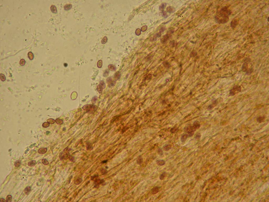 Une des particularités du genre Cortinarius est d'avoir les spores verruqueuses, ce qui n'est pas trop visible sur les photos. Les mesures citées par la plupart des auteurs sont de 7-9 x 4,5-5,5 µm, après ....
