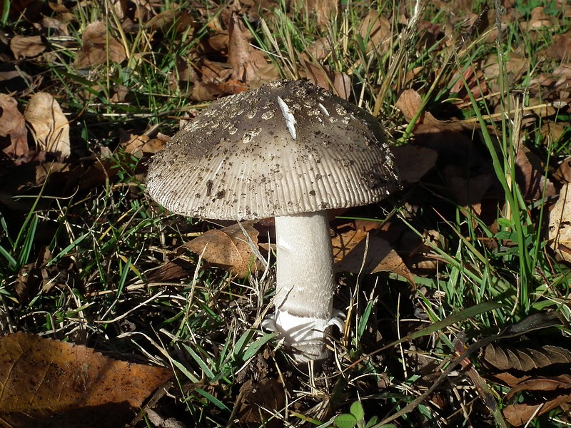 Reste de voiles sur chapeau gris plus clair à la marge (diam. env.10 cm), marge cannelée, lames serrées apparemment floconneuses (photo 2). Je pense à l'Amanite martelée ! Merci pour vos avis !
