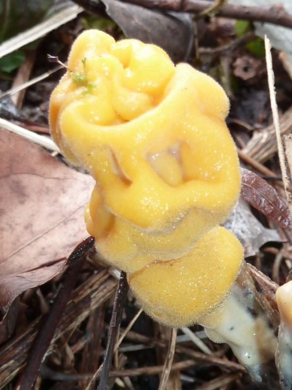 Le plus gros était aussi le plus frais : encore ferme (consistance d'un chou-fleur), d'un beau jaune d’œuf, satiné sans doute parce que légèrement duveteux (ce qu'on voit bien sur les photos avec flash). Les autres spécimens avaient plus ou moins virés au gris clair et étaient partiellement déliquescents.