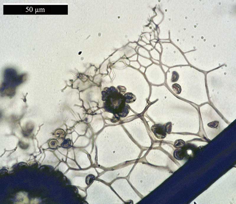 En forme d’épi de Typha. Partie sporulante marron de 0,3 x 3 mm, posée sur un pied de 1 mm. Pas d’entonnoir à la base ni de cuticule autour. Capillitium en filet. Spores échinulées 8,7-9,2 µm
