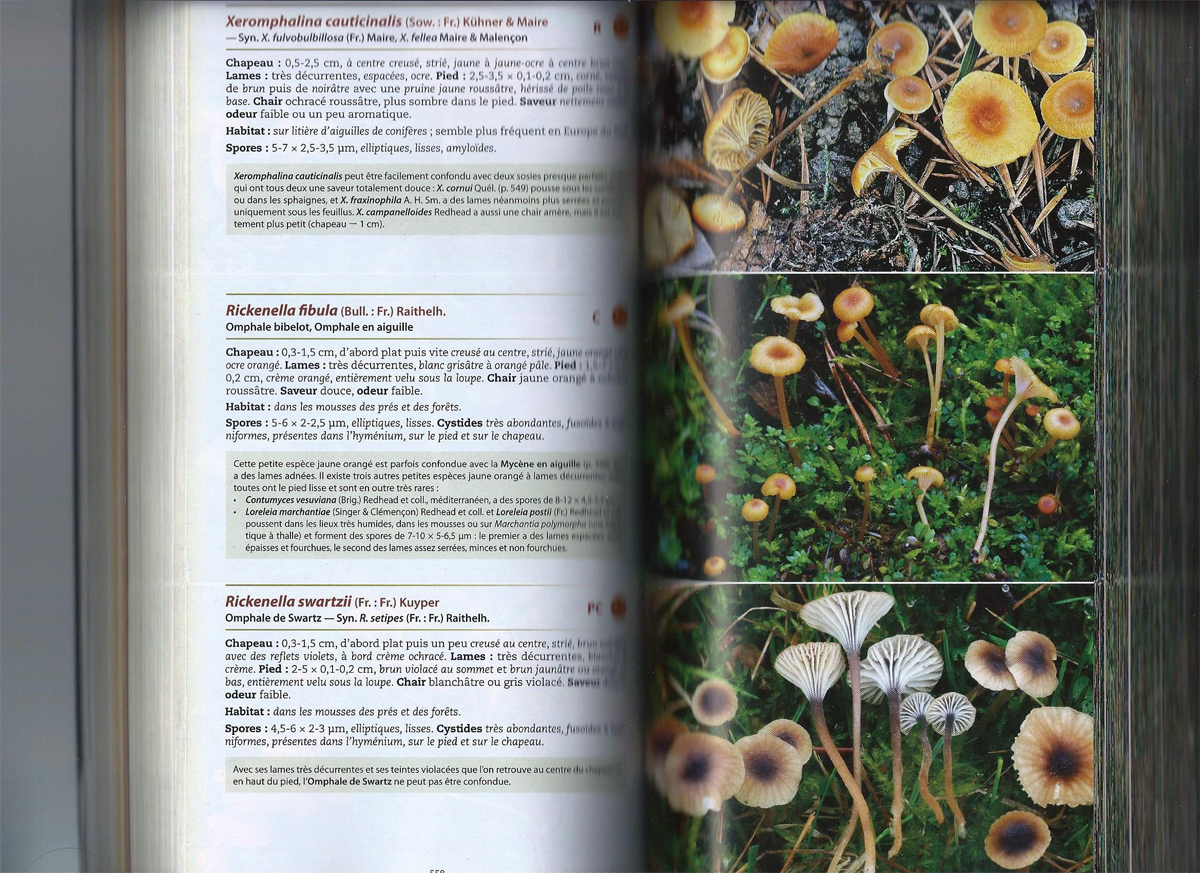 Pour Fany, on va préciser que la petite sœur, plus commune, est Rickenella fibula, l'omphale-épingle ou omphale-aiguille ou omphale bibelot dont tu trouveras plusieurs photos sur le site, notamment celle-ci de Bobabar qui en montre bien la minusculité, si je peux dire.