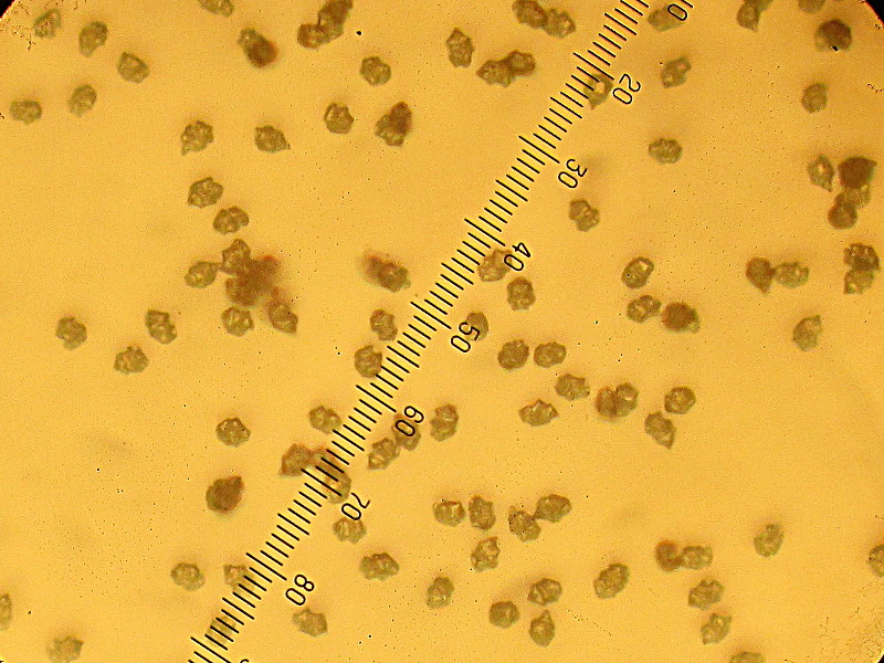 Spores : voici la photo ( Echelle : 1div = 2,5µm ) , ainsi qu'une vue des lames, plus rapprochée.