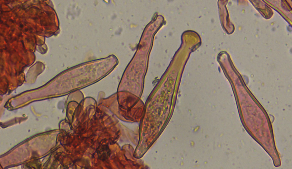 Cheilocystides mêlées à de nombreuses cellules clavées et pleurocystides parfois subcapitées.