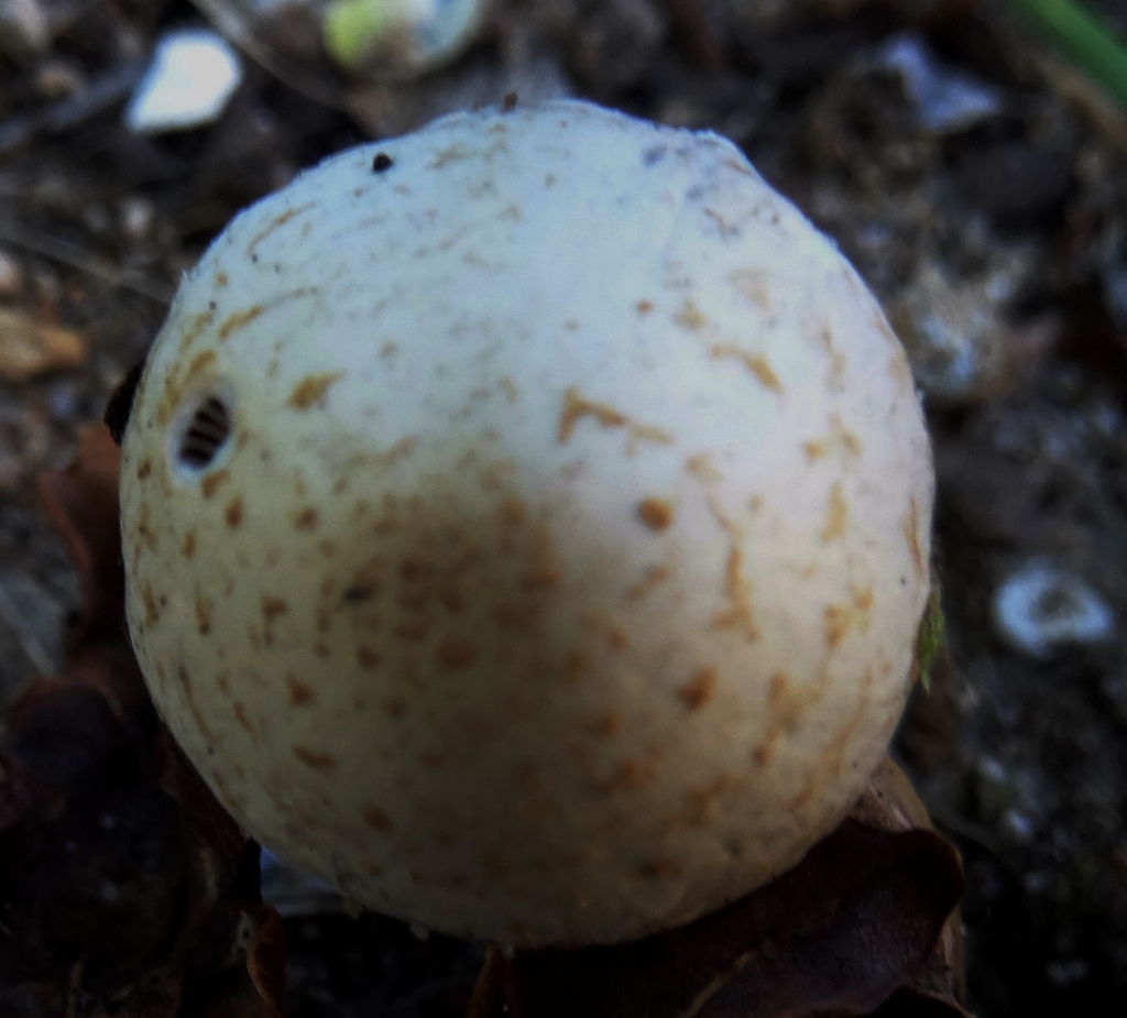 Chapeau : 2 cm blanc crème avec des mèches en écailles brunes, rouilles bien visibles à la loupe et plus importantes sur la marge,mais blanches à ce niveau.