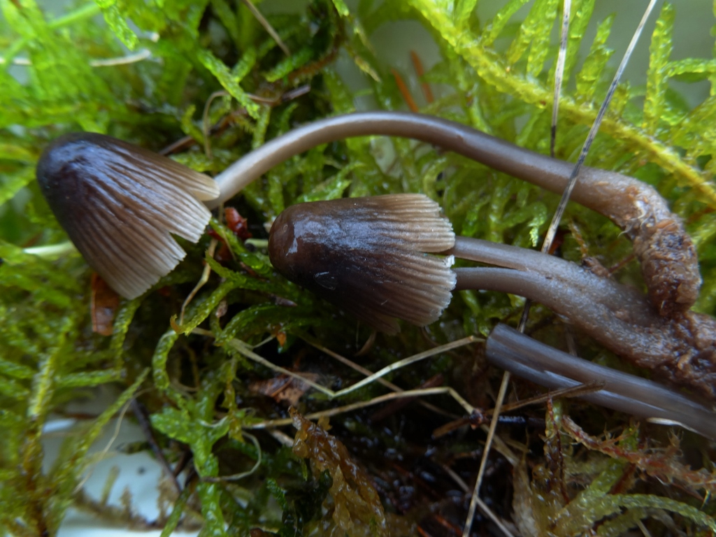 Chapeau : 1 cm de diamètre sur 1,6 cm de hauteur, brun noirâtre, marge blanchâtre, strié.