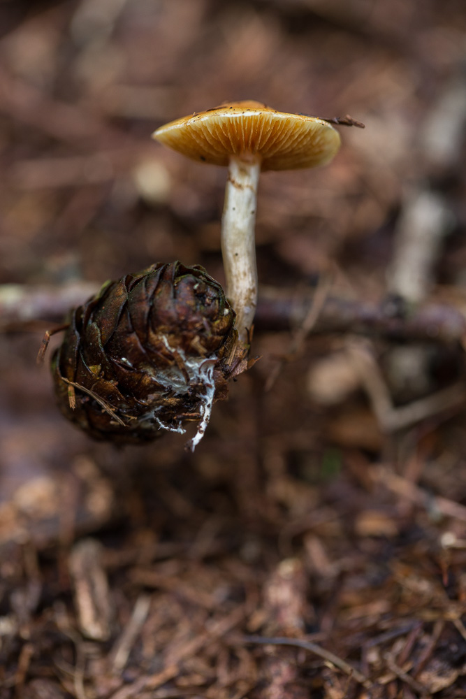 Aussi, l'avant-dernière photo, c'est un champignon en lévitation ? J'ai du mal à comprendre la position du carpophore, il ne pousse pas sur le cône ?