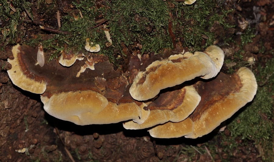 Phaeolus schweinitzii est assez polymorphe mais comme toi j'ai du mal à reconnaître ici : pas son mode de croissance ni ses tons habituels ni même vraiment son habitat, il pousse de préférence à la base du tronc d'arbres vivants (même s'il peut les accompagner après leur mort). Cherchons un peu ailleurs, même si dans l'immédiat je n'ai rien à proposer.