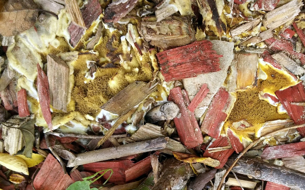 Je ne sais pas si la mérule (Serpula lacrymans) aime tellement le "mulch", ça y ressemble un peu mais ça peut être aussi une Phlebia ou autre chose, je ne connais rien à ces bêtes-là, attendons des avis plus avisés. En attendant, deux choses : essaie de définir la nature du bois (feuillu ou conifère) et la nature de l'odeur, ça ne servira peut-être à rien mais on ne sait jamais.