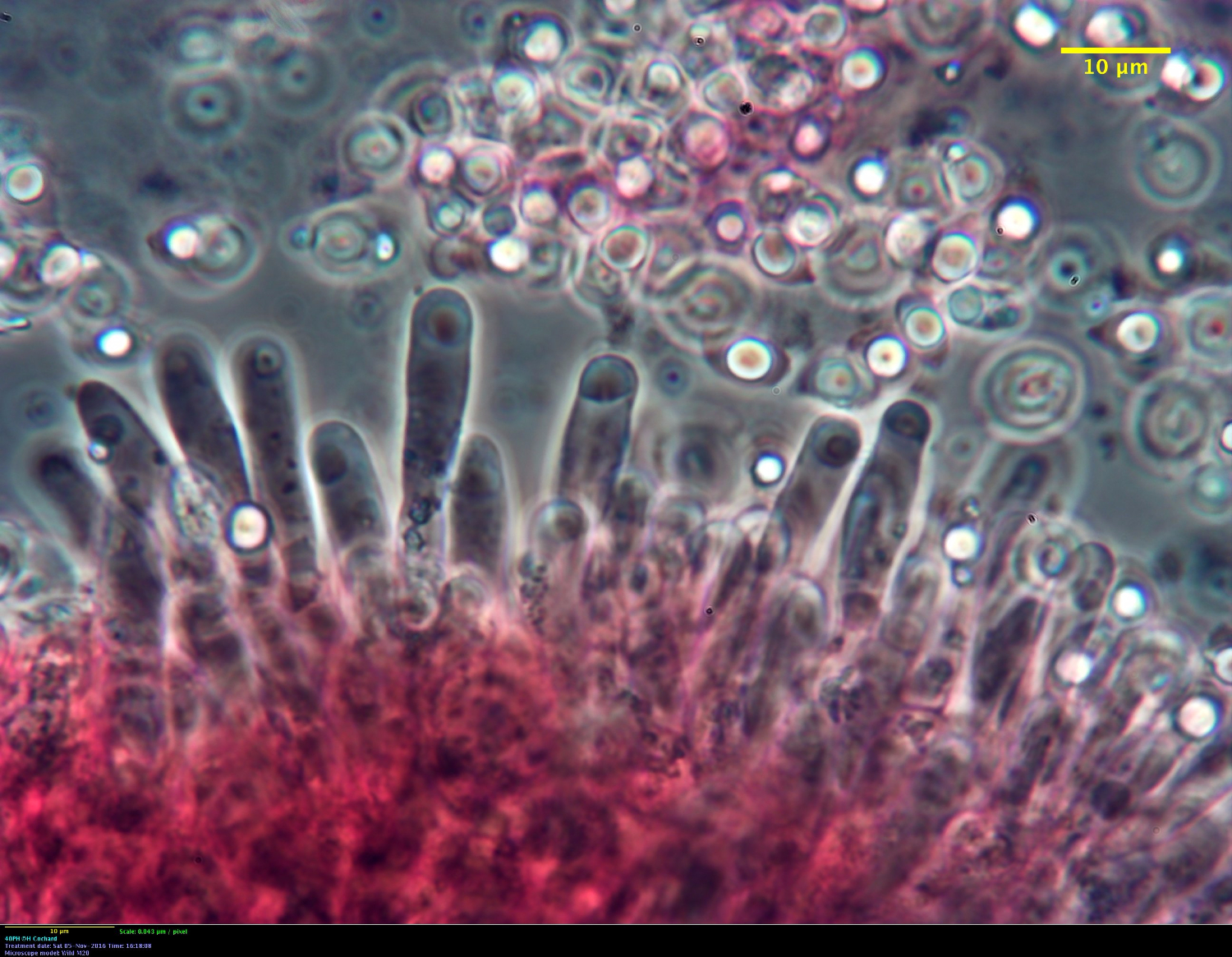 Les cheilocystides sont un peu ventrues ici, elles sont souvent plus cylindriques: Tes caulocystides sont typiques par contre. comme ici: La cuticule est effectivement difficile à observer car c'est tout gélifié et ça prend mal le colorant. En contraste de phase on voit mieux sa structure: C'est une espèce assez fréquente.