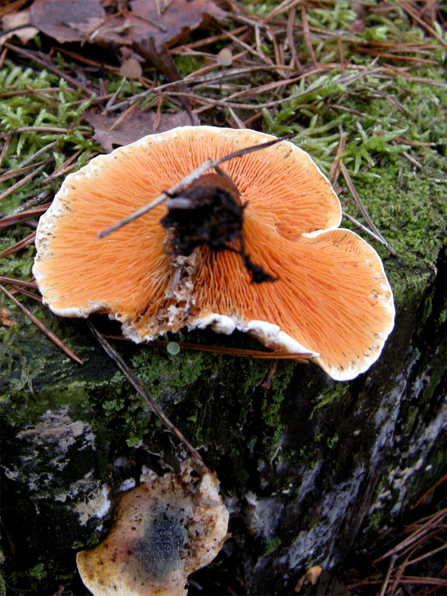 - d'autre part elles sont extrêmement polymorphes : quelques unes étaient intégralement orangées comme celles-ci (d'ailleurs photographiées à Ermrenonville), d'autres étaient un peu verdâtres (algues), beaucoup d'autres étaient brunâtres comme ci-dessus, à lames orangées et à pied brun, et enfin un grand nombre étaient carrément noirâtres, sans être forcément vieilles, avec des lames pâles et le pied noir, comme ci-dessous. S'agit-il de la même espèce ? d'une variété ? d'un autre Hygrophoropsis ? d'un tout autre champignon ? (auquel cas j'ouvrirai un autre fil).