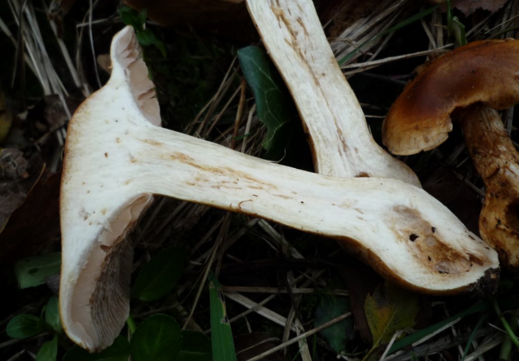 Pied : 9.5*1.9 (3.4 au bulbe) cm. Sec. Brunâtre ochracé sur fond plus clair. Nettement bulbeux arrondi, à bulbe non marginé.