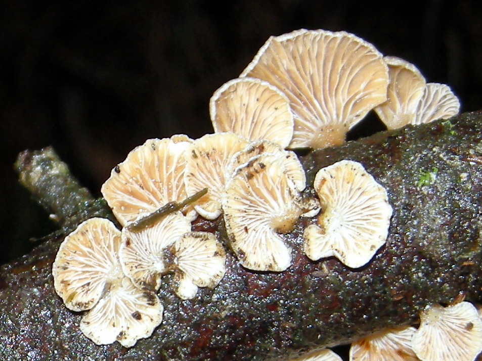 Re-regardé Panellus mitis. De tout ce que j'ai vu, il fait partie des possibles, notamment par l'habitat ou le petit pied qui s'arrête en arrondi net comme chez stipticus, mais je ne retrouve pas la pellicule gélatineuse du chapeau (ils étaient tout juste gras) ni l'aspect givré qu'on voit par exemple sur les toujours excellentes photos de Hlasek ni la marge ourlée. Ni des lames aussi espacées et tourmentées.