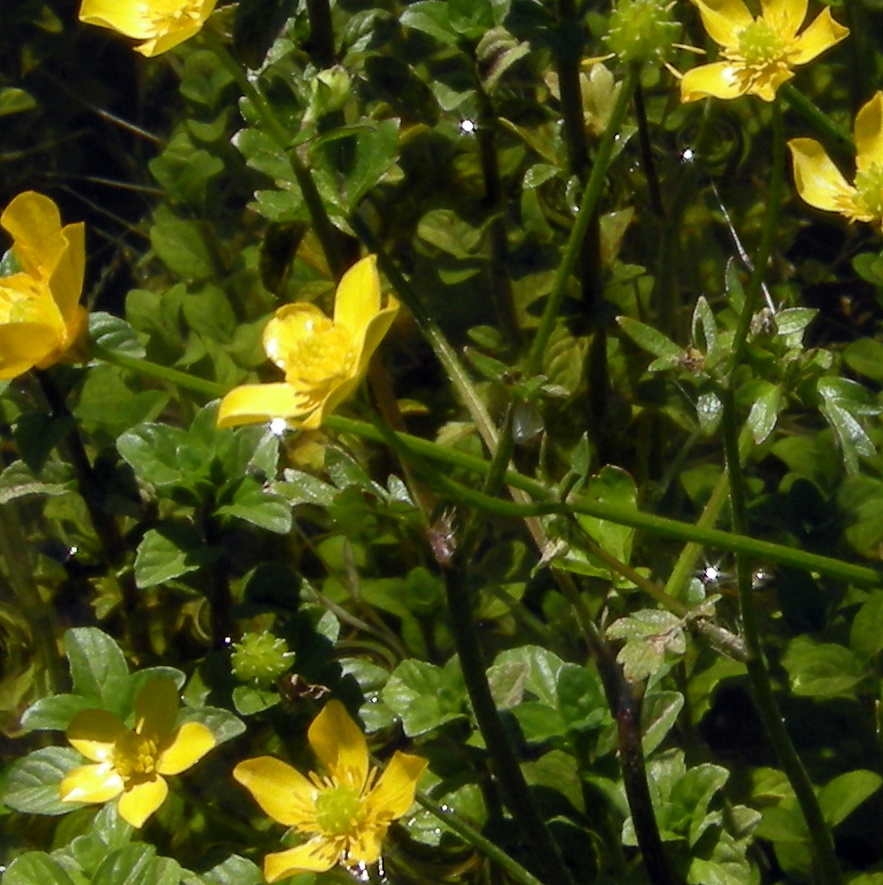 Pouvez-vous me dire le nom de cette espèce au milieu des reflets en étoiles, une renoncule sans doute, peut-être déjà vue :