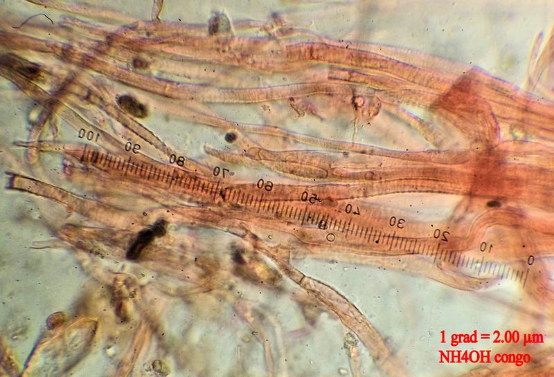 On remarquera par ailleurs, sur ma photo des cheilocystides, que certaines ont tendance à se nécropigmenter, c'est-à-dire à voir son contenu prendre une couleur de jaune soutenu à brun rouge, et un aspect parfois un peu consistant. D'après mon expérience, ce n'est pas si rare chez les Inos, en particulier dans la section Praetervisae, stipe noircissant ou pas. Il ne s'agit pas d'une réaction à l'ammoniaque, comme certains parfois peuvent le penser. I. phaeocystidiosa est par contre la seule à posséder des caulocystides franchement noircissantes.