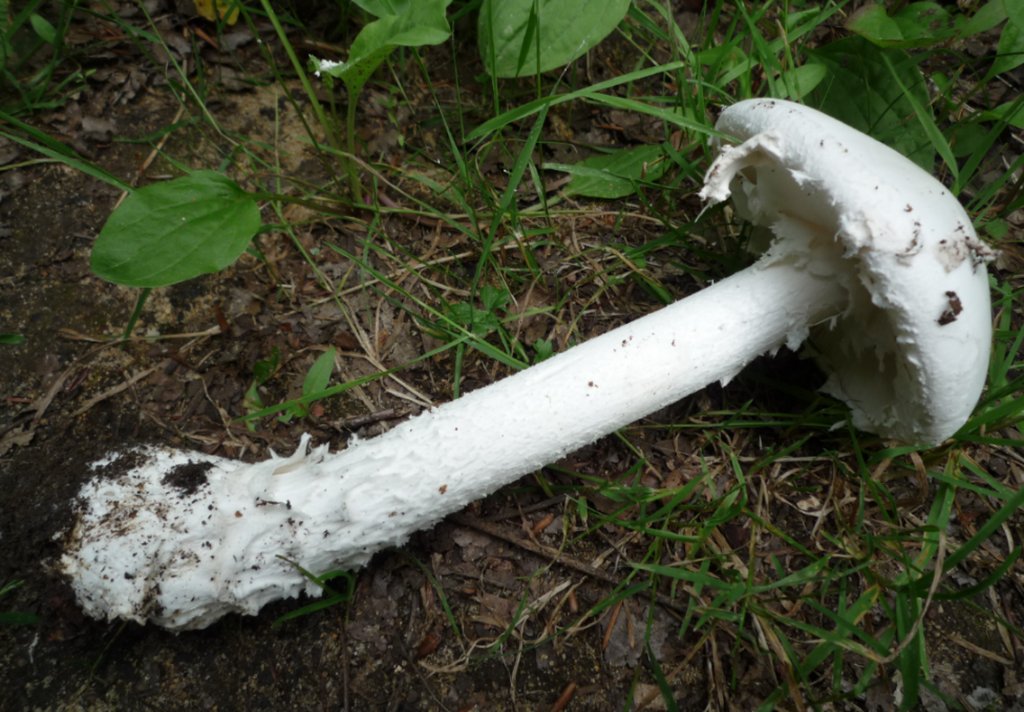 Une autre a poussé à côté (deux photos ci-dessous), d'aspect plus trompeur par son chapeau peu garni de voile et ses dimensions moindres, d'autant plus que ce lieu est également très prisé d'Amanita virosa var. levipes très présente actuellement. Sans trouver la grosse, je pense que par manque de d'attention et de mémoire, je me serais fait avoir pour l'autre...