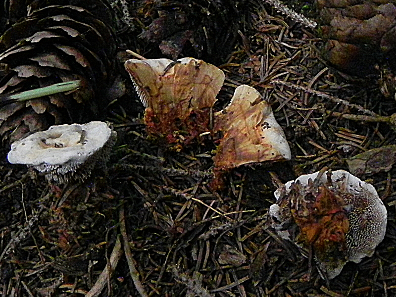 Je suis arrivé ici à Hydnellum aurantiacum, compte-tenu de la présence de zones oranges sur le dessus des chapeaux et de l'absence de teintes bleues.