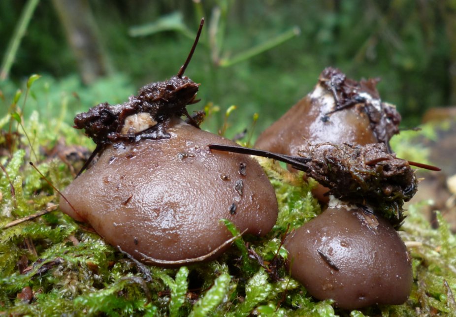 Petite troupe de pézizes, au sol, dans une vase forestière, lieu raviné d'écoulement, sous mélèzes, sapin, chêne. Certaines atteignent des tailles avoisinant les 10 cm. On remarque nettement, chez les exemplaires pas trop vieux la couleur olivâtre de la surface fertile, alors que l'envers est brun légèrement rougeâtre. En voici les photos, hors de leur environnement très sombre. Correspondent-elles avec Peziza limnaea ? Je remarque aussi que Peziza depressa est donnée proche. Merci pour vos avis.