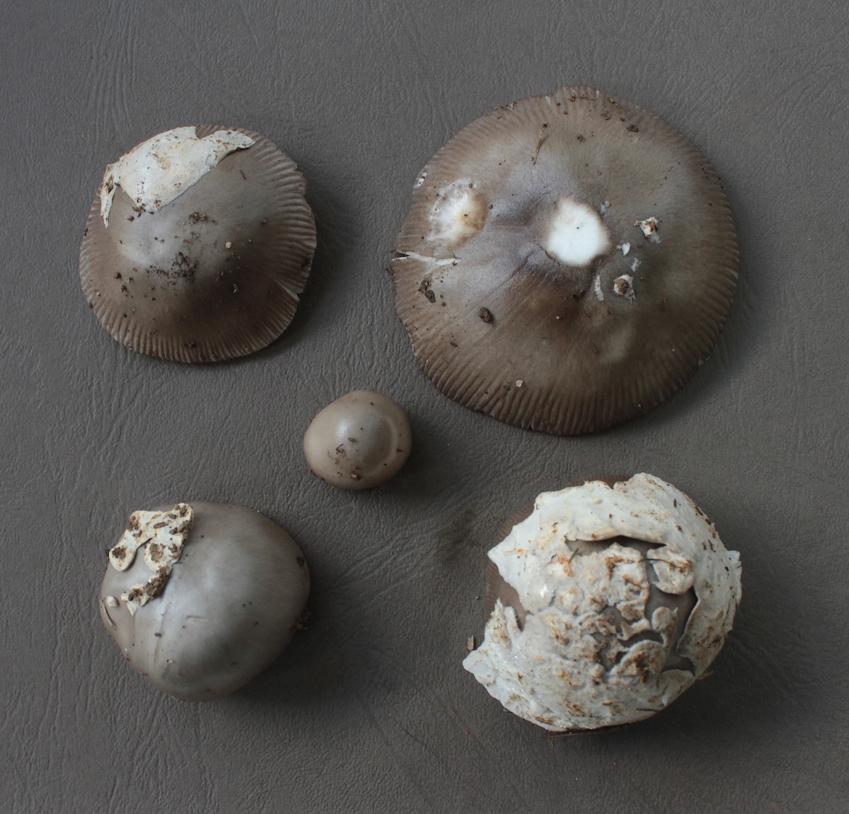 Chapeau : 5 à 12 cm, gris (c'est la photo qui m'a donné des teintes violacées sur certains exemplaires au soleil), marge cannelée, avec des restes de voile (ou non) épais.