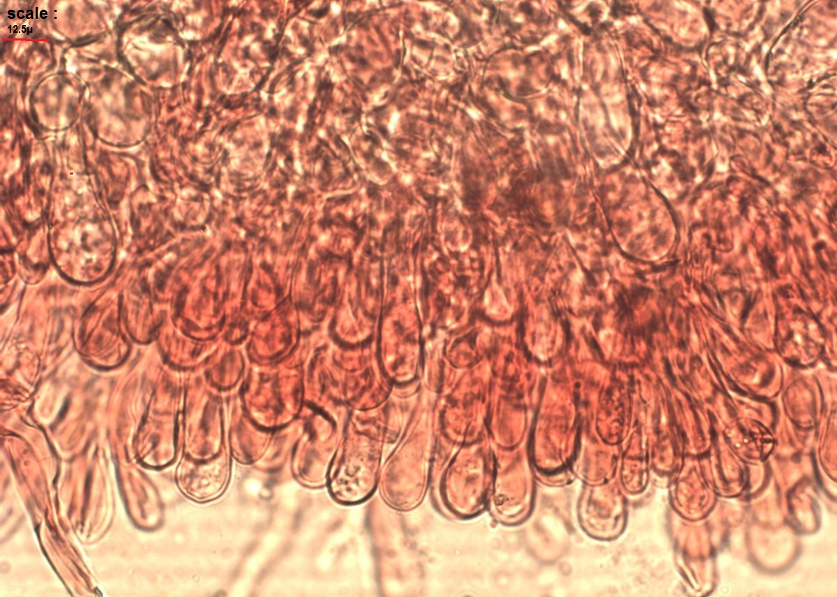 J'ai mesuré les spores sur l'exsiccata envoyé par Richmond : 15-19 x 10-13 µm plus longues et plus larges que le type. Avec l'arête colorée que l'on voit encore bien sur l'exsic il s'agit bien de la forme marginata. Sur la monographie de Petersen paru en 2010 (revue Nova Hedwigia) la taille des spores est également précisée plus grande (13,5-18 x 10-14 µm) ce qui correspond donc bien avec le champignon récolté.