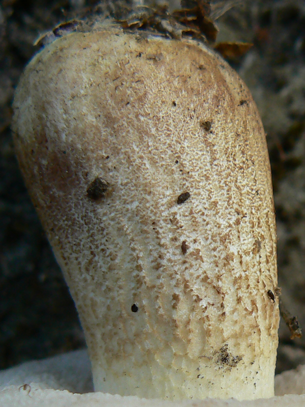 Pied crème sale, puis jaunâtre à brunâtre. Début de réseau en haut du pied, réseau devenant grossier brun sur le reste du pied.