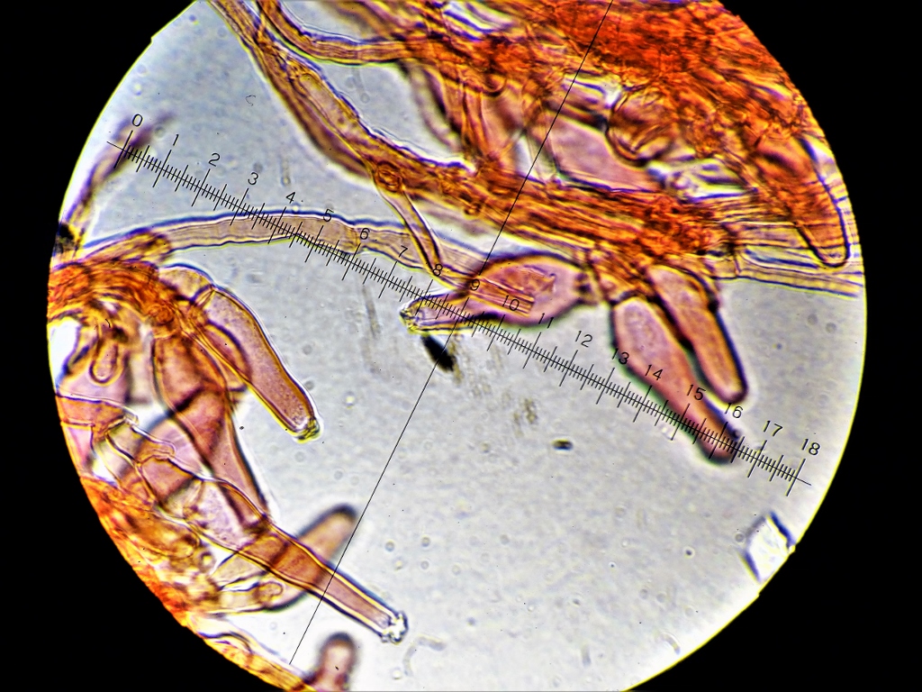 Je trouve aussi une différence micro (je ne sais pas si cela a une importance). Sur ma préparation je n'ai pas observé de grandes quantité de cheilocystides, alors que sur ta publication elles se sont manifestement toutes bousculées pour être sur la photo.