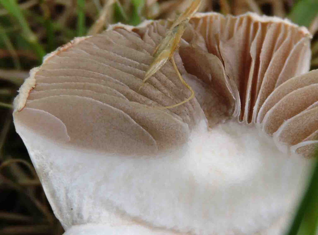 Bonjour, ce n'est pas un Lepista, avec ces caractéristiques... Je ne veux pas donner le genre tout de suite, je te laisse chercher un petit peu, avec ces lames brunâtres et ce chapeau blanchâtre, habitat dans l'herbe...