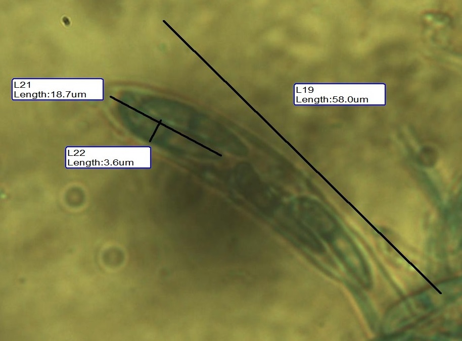 J'ai néanmoins pu voir quelques asques et spores dont les dimensions correspondent peu ou prou (difficile de placer le curseur des mesures quand la base de l'asque est noyée dans le contexte) à ce que je soupçonnais macroscopiquement. Les spores sont encore dans les asques et les mesures ne correspondent pas forcément aux mesures sur sporée (chose difficile à envisager), mais ça donne un ordre de grandeur. J'arrive à Hymenoscyphus fraxineus ou albidus, sans pouvoir trancher, je n'ai pas mis en évidence de crochets à la base des asques. A moins que ce soit autre chose.