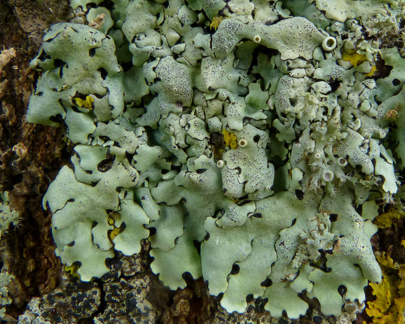 Voici les macules qu'il aurait dû observer (exemple sur un autre lichen, Physcia aipolia) :