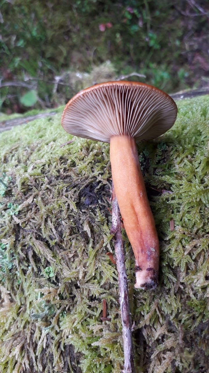 Ce Lactaire au lait blanc était présent sous résineux bien caché sous des ronces et seulement aperçu grâce à son chapeau orange saumon vif et lisse.