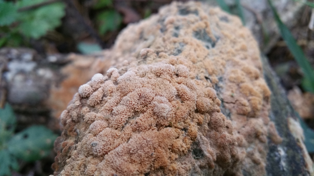 Claudius a écrit :Une idée sotte et grenue... Pourquoi pas Ceratiomyxa poroides ?la consistance est dure et a certain endroit, il y a bien une marge stérile et blanchâtre comme l'indique MycoDB. Le dessous de la branche correspond plus à certaines photos de la description. Je disais précédemment que les "choux fleurs" (présent sur le dessus uniquement) était de l'ordre du centimètre, mais en fait c'est un peu plus petit (genre quelques millimètres, cf. photo avec le doigt, désolé, j'ai oublié le mètre