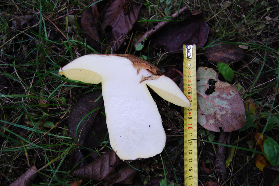 Boletus appendiculatus, suggéré par Richmond, est proche de ce qu'on voit ici mais a le pied et les pores bleuissants au toucher, ce que tu ne signales pas ; subappendiculatus est dit plus montagnard ; dans le même groupe, les autres ont la chair bleuissante, il faut peut-être regarder ailleurs. Bref, pas d'idée, impolitus ?