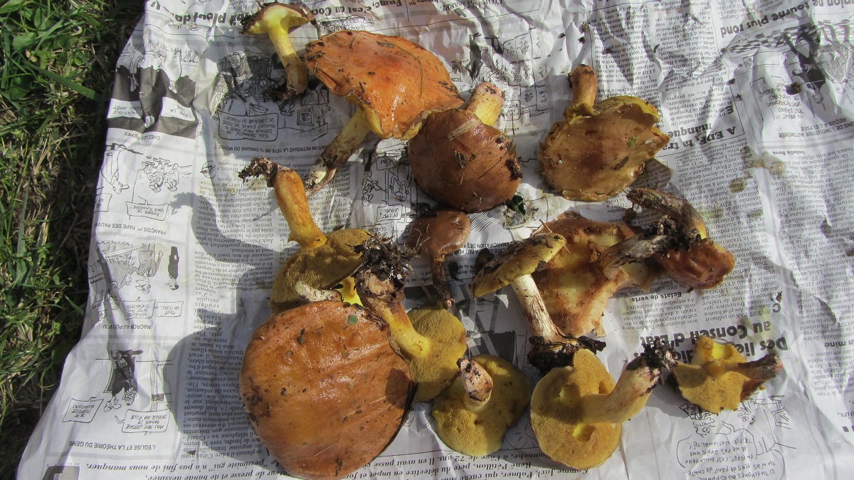 La première photo ne sert à rien sauf si l'on veut lire le journal, elle peut être supprimée. La deuxième montre la même récolte avec une vision plus nette du chapeau. As-tu un livre de mycologie à ta disposition ?