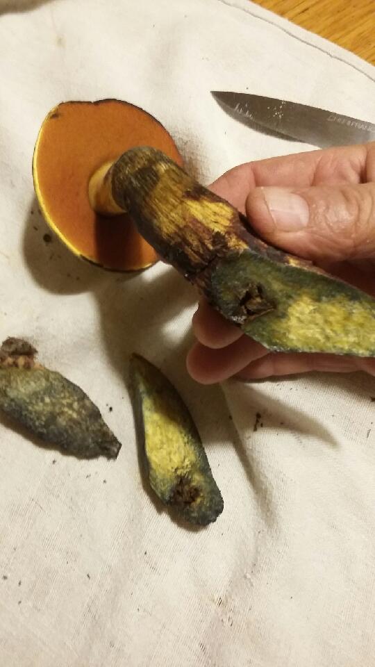 C'est mon père qui a trouvé ça mercredi dernier, la couleur générale assez jaune et l'absence quasi totale de rouge l'a intrigué. Il pensait en premier lieu à B. erythropus un peu décoloré (ou Neoboletus luridiformis pour ceux qui aiment les noms récents). Récolté sur terrain plutôt granitique, sous chênes mêlés de quelques hêtres, chapeau jaunâtre, chair bleuissant fortement, absence de réseau sur le pied plutôt couvert de ponctuations concolores (dc jaunes), et surface du stipe brunissant au toucher, pores orangés. Il manque donc le brun du chapeau et surtout les ponctuations rouges sur le stipe pour en faire un erythropus typique. Il m'a parlé aussi du Bolet jonquille, mais dont les pores restent apparemment jaunâtres sans orange ou rouge, présenté parfois comme espèce à part mais qui semble considéré aujourd'hui, si je comprends bien, comme la variété discolor du bolet à pied rouge. On le trouve aussi, dans la 4ème édition du GEPR, sous le nom de Neoboletus junquilleus. Et il y est également fait mention de Neoboletus xanthopus en note sous le bolet à pied rouge, qui pourrait aussi correspondre. J'avoue mal comprendre les limites entre ces différents taxons.